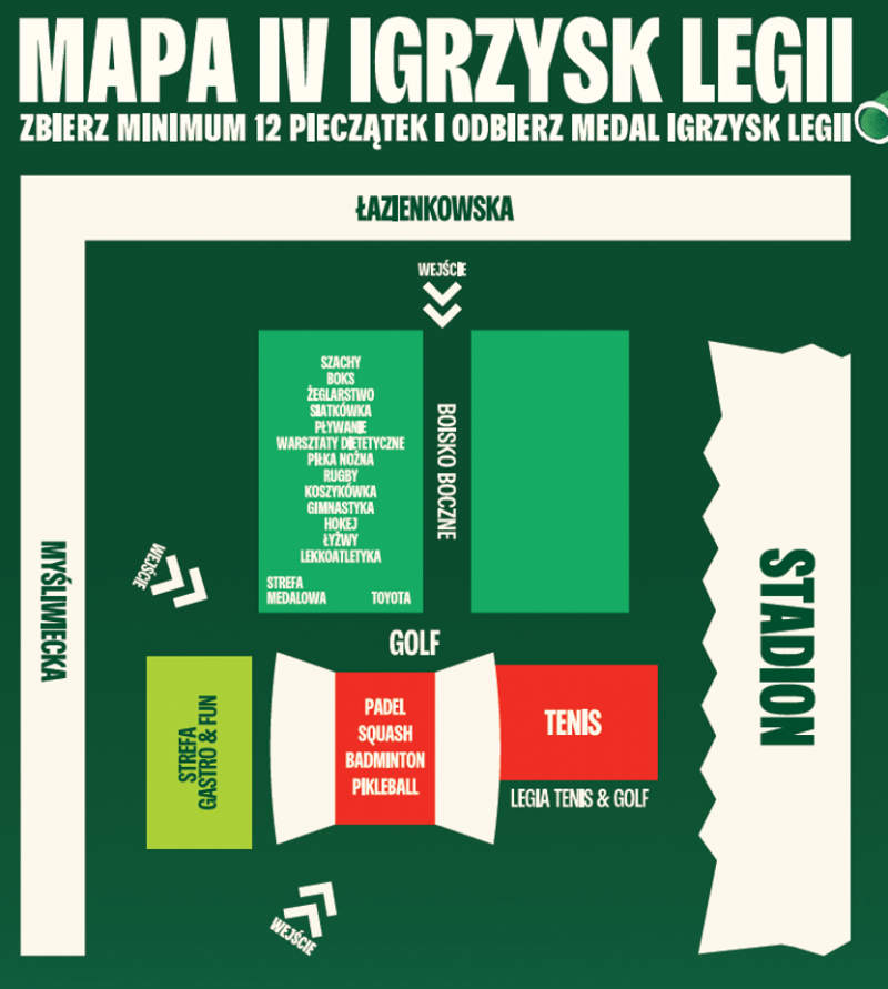 Przygotowaliśmy dziesiątki stanowisk i aktywności, a uczestnicy będą mogli spróbować treningów w wielu dyscyplinach sportowych. Każdy, kto weźmie udział w wyzwaniach i ćwiczeniach, otrzyma specjalną kartę do zbierania pieczątek. Jeśli uda się zebrać ich wystarczająco dużo – na zakończenie czeka Medal Igrzysk Legii, symbol sportowej wytrwałości i prawdziwego legijnego ducha.